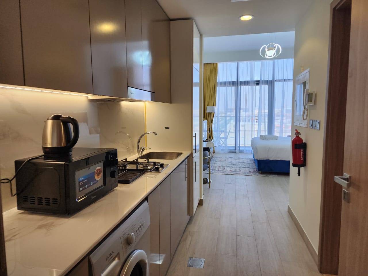 This modern studio apartment features a smart layout with quality finishes, offering a comfortable and efficient living space within a vibrant waterfront community.